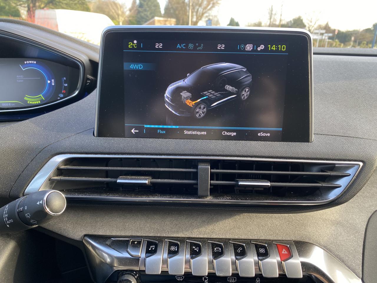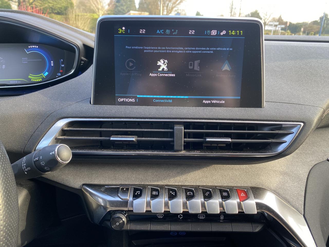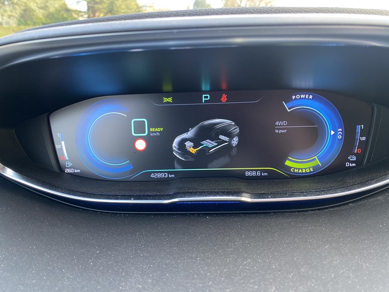 2 spots de lecture à l'arrièreABS avec répartiteur électronique de freinage (REF) et aide au freinage d'urgence (AFU)Accès et démarrage mains-libresAccoudoir central avant à ouverture papillon, avec compartiment de rangement éclairé et réfrigérableAide graphique et sonore au stationnement arrièreAir conditionné automatique bi-zone avec aérateurs aux places arrièreAirbags frontaux conducteur et passager adaptatifsAirbags latéraux conducteur et passager avantAirbags rideaux de tête aux places avant et arrièreAlerte de temps de conduiteAppuis-tête à sécurité optimisée réglables en hauteur sur les sièges conducteur et passager avant ainsi que sur les places latérales arrièresAVAS : système d'alerte sonore du véhicule émis à faible allure en roulage électrique, audible depuis l'extérieur pour la sécurité des piétonsBadge "HYBRID4" sur ailes avant et volet de coffreBandeau de pare-choc arrière chroméBanquette rabattable 1/3 - 2/3 (commandes dans le coffre) avec accoudoir et trappe à skisBarres de toit longitudinales profilées en aluminiumBoîte à gants floquée et éclairéeBoitiers de rétroviseurs extérieurs Noir Perla NeraCalandre avec jonc périphérique chrome brillant et satiné, damier chromé et lettrage Peugeot noirCanules d'échappement chroméesCeintures avant à 3 points, réglables en hauteur, avec prétensionneurs et limiteurs d'effortCeintures de sécurité arrière trois points à enrouleur (x3), avec prétensionneurs et limiteurs d'effort aux places latéralesChargeur 3,7 kW + Cable de recharge T2 avec prise muraleCommande de verrouillage à distance (deux plips)Contrôle de la charge de la batterie à distanceContrôle dynamique de stabilité CDS avec antipatinage électronique ASRDécors de planche de bord et panneaux de portes AlcantaraDécors de planche de bord et panneaux de portes bois chêne gris en liaison avec le Pack Cuir 'NappaDécors intérieurs (baguettes de planche de bord et panneaux de portes, enjoliveur de console) chrome satinDétection de sous-gonflage indirecteDirection assistée électrique, avec colonne de direction réglable en hauteur et profondeur (mécanique)Driver Sport PackEclairage intérieur à LED : plafonniers, rangements, coffreEcrous antivolEnjoliveurs d'arc de pavillon en inoxEnjoliveurs en inox sur les protecteurs de bas de portesEssuie-glace arrière avec déclenchement automatique en marche arrièreEssuie-vitre avant avec système de lavage 'Magic Wash'Filets aumônières au dos des sièges avantFixations pour trois sièges enfants suivant norme ISOFIX aux places passager avant et latérales arrièreFonction Mirror ScreenFrein de stationnement électrique avec aide au démarrage en penteHabitacle et ciel de pavillon Noir MistralHayon mains libres : volet de coffre motorisé avec accès mains libresIndicateur de rapportInserts d'ailes avant chromésJantes alliage 19" 'Washington'Joncs de vitres latérales en inoxKit de dépannage pneumatiqueLève-vitres électriques avant et arrière, séquentiels et antipincementLunette arrière chauffante avec antennes sérigraphiéesMiroirs de courtoisie éclairésPédalier et repose-pied conducteur en aluminiumPack City 1Pack Drive Assist PlusPack Eclairage d'ambiancePack Safety PlusPack VisibilitéPassages de roues rapportés noirs élargisPeugeot Connect : Navigation 3D connectée avec reconnaissance vocale + PEUGEOT Connect SOS & AssistancePeugeot i-Cockpit combiné tête haute numérique reconfigurable, écran tactile capacitif 8" et volant compact multi-fonctionsPlafonnier avant avec spots de lecture (x2) et plafonnier arrière à extinction temporiséePlanche de bord surpiquéePlancher de coffre fixe avec articulation pour accès au coffre de rangement du câble de rechargePré-chauffage / climatisation du véhicule à distancePrise 12V (x3) : à l'avant, à l'arrière et dans le coffrePrise USBProjecteurs 'Peugeot Full LED Technology'Régulateur et limiteur de vitesseRétroviseur intérieur photosensible frameless (sans cadre) avec témoin lumineux d'information roulage mode ELECTRICRétroviseurs extérieur électriques et dégivrantsRétroviseurs extérieurs rabattables électriquement avec éclairage d'approche à LEDRadio 6 HP, bi-tuner compatible MP3 et connectivité Bluetooth (audio streaming, kit mains libres), avec commandes au volant, écran tactile capacitif 8"Radio numérique terrestreReconnaissance étendue des panneaux de signalisation et préconisation de vitesseSécurité enfant électrique des vitres arrièreSélecteur de modes de conduite modes Electric/Sport/HYBRID/4WDSabot de pare-choc avant gris métalliséSellerie TEP & Alcantara 'Gris Gréval'Seuils de portes avant en inoxSiège conducteur à réglage lombaireSiège conducteur réglage en hauteurSiège passager à réglage manuel en hauteurSiège passager avant avec mise en tabletteSurtapis aux places avant et arrièreTeinte de caisse Gris HurricaneToggle Switches' chromés (touches 'piano' d'activation des fonctions de l'écran tactile)Toit 'Black Diamond' (toit Noir Perla Nera)Trappe de recharge électrique sur l'aile arrière gauche, avec indicateur lumineux d'état de rechargeVerrouillage automatique de tous les ouvrants en roulantVitres latérales et lunette arrière surteintéesVitres latérales feuilletées acoustiques à l'avantVolant cuir pleine fleur perforé avec bagues chrome acier et badge GT